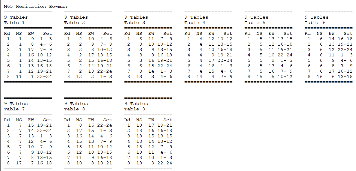 For 9 full tables we have used the same movement and managed the board sharing required by table 9 without too much difficulty. The last round requires an arrow switch on tables 1 to 7, but understandably not on the hesitation table 8. On tbl 9 however NS on table 9 are not required to switch on Scorebridge/Bridgemates.